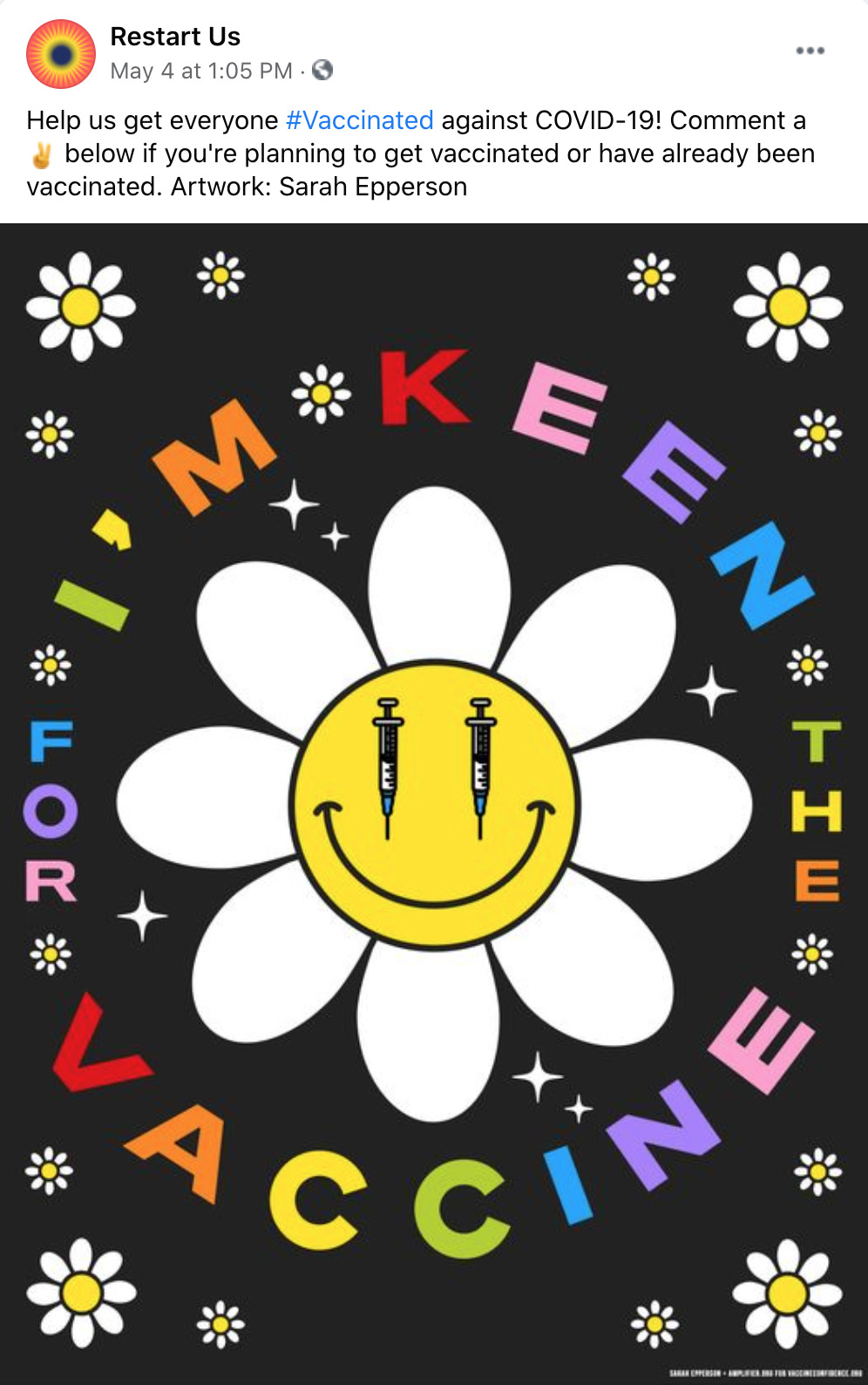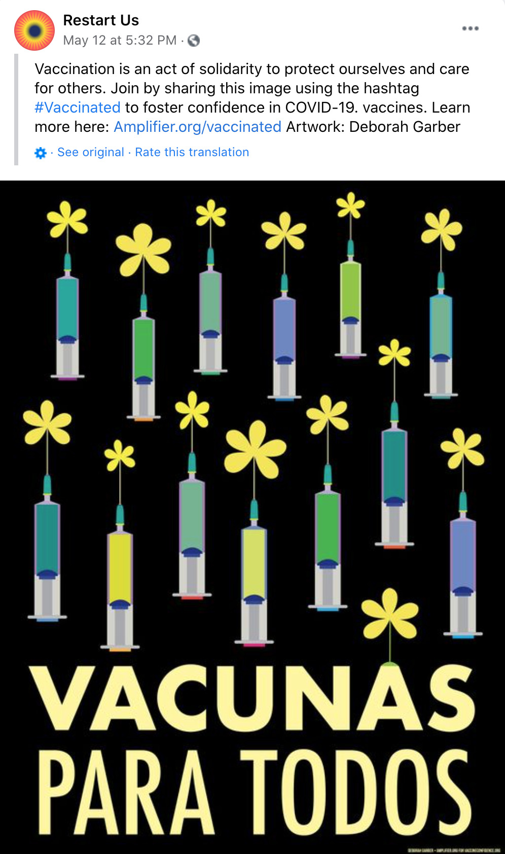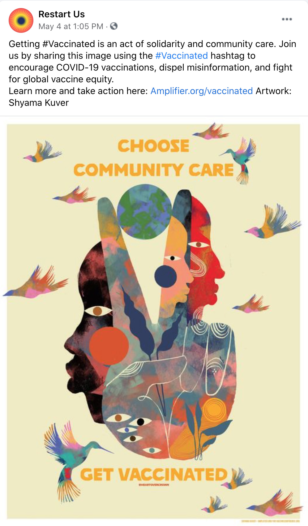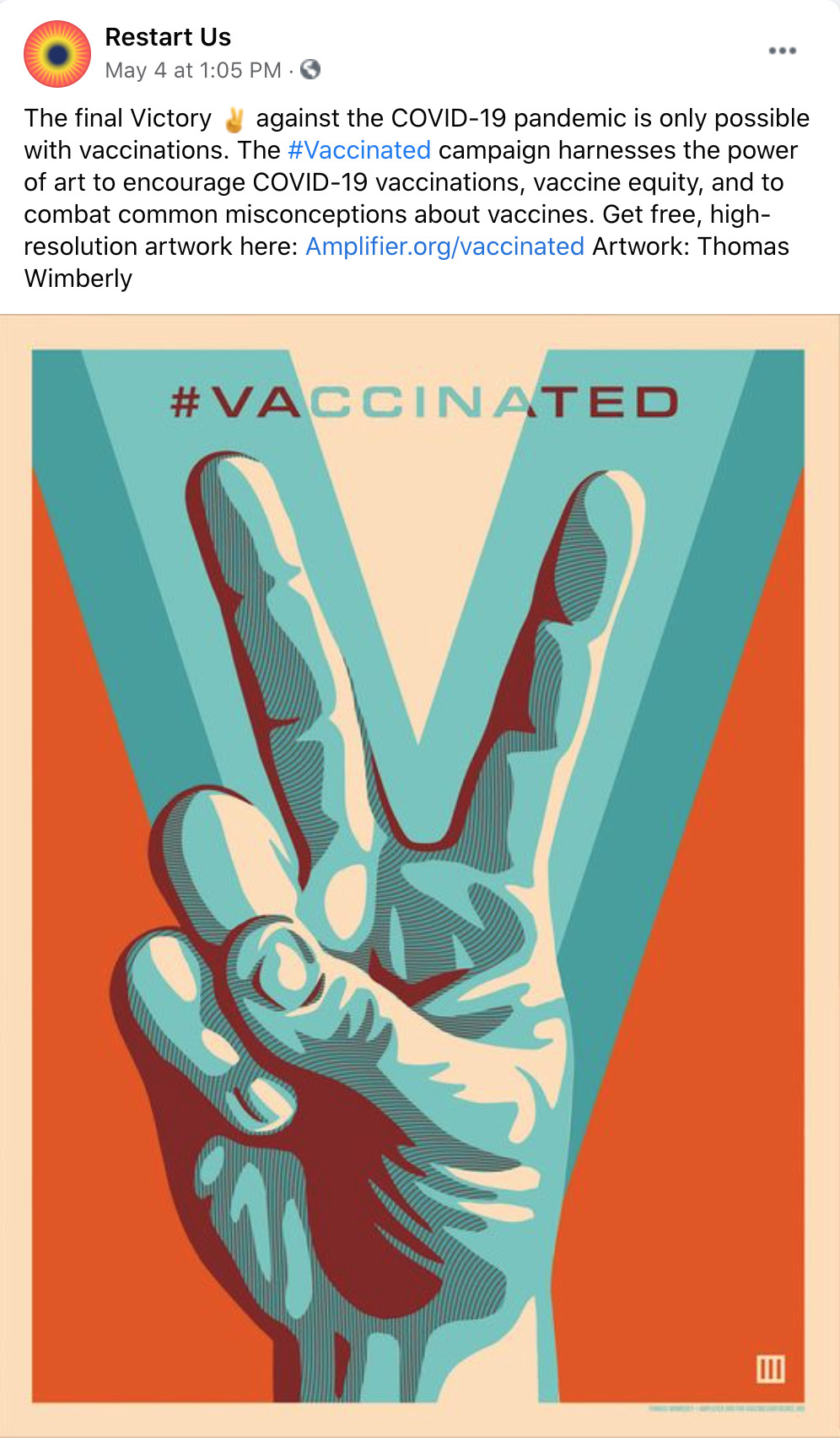 Amplifier is a Seattle-based nonprofit design lab started by Aaron Huey. It deploying artist-created visual content to shift culture of vaccine apprehension and increase adoption. We have partnered with Facebook on this campaign who is offering free post-boosting to any partner who posts this rich content.