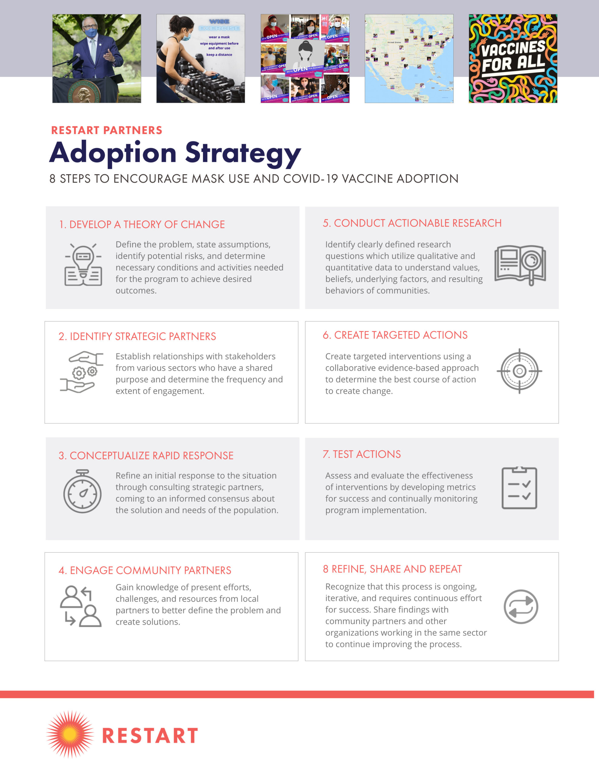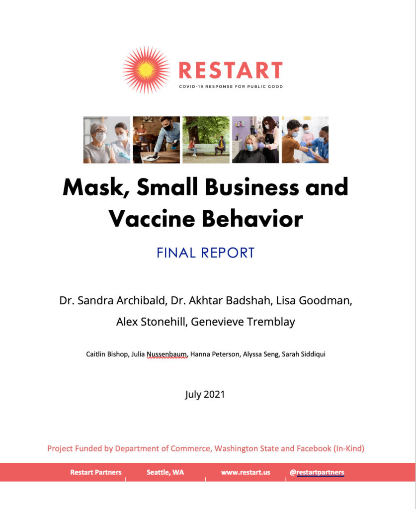 The severity of the rapidly-evolving COVID-19 pandemic warrants a creative, novel, and sustained approach to encourage public health protocol, keeping people safe and the economy open. With support from the Washington State Department of Commerce, Facebook, and Upswell partners, Restart partners was able to undertake three major social media campaigns to improve public health outcomes and more safely reopen the economy: Mask Adoption, Small Businesses, and Vaccine Adoption.