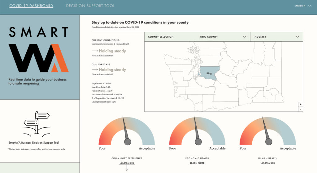 The decision support tools include a business scorecard dashboard and a policy simulation tool, which will be powered by public health and commerce data, behavioral choice experiments, and machine learning. The SmartWA mobile tool is designed as a one-stop shop for small businesses in WA to help them navigate the COVID-19 reopening requirements, available resources for small business owners, as well as to aide their decision making by providing real-time assessment and forecast of public health, economy, and community experience. These assessments are composite scores based on a number of data sources from government agencies and other reputable resources. The information is county and industry specific and is available in 5 languages: English, Spanish, Tagalog, Simplified Chinese, and Vietnamese.